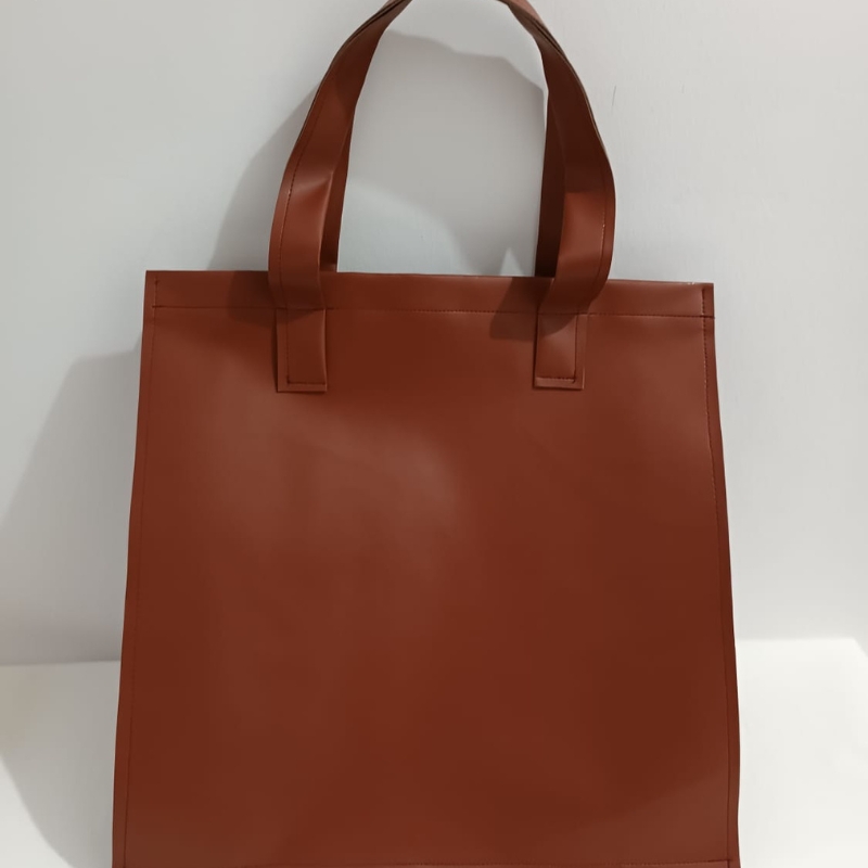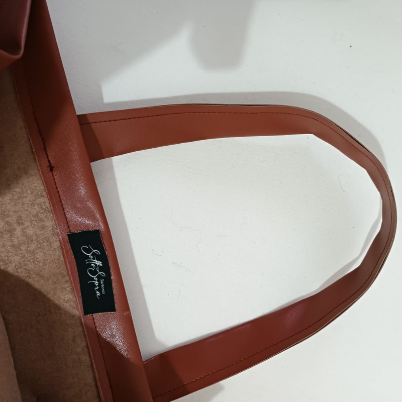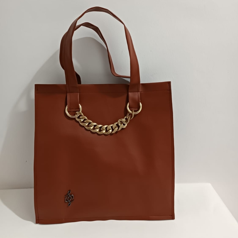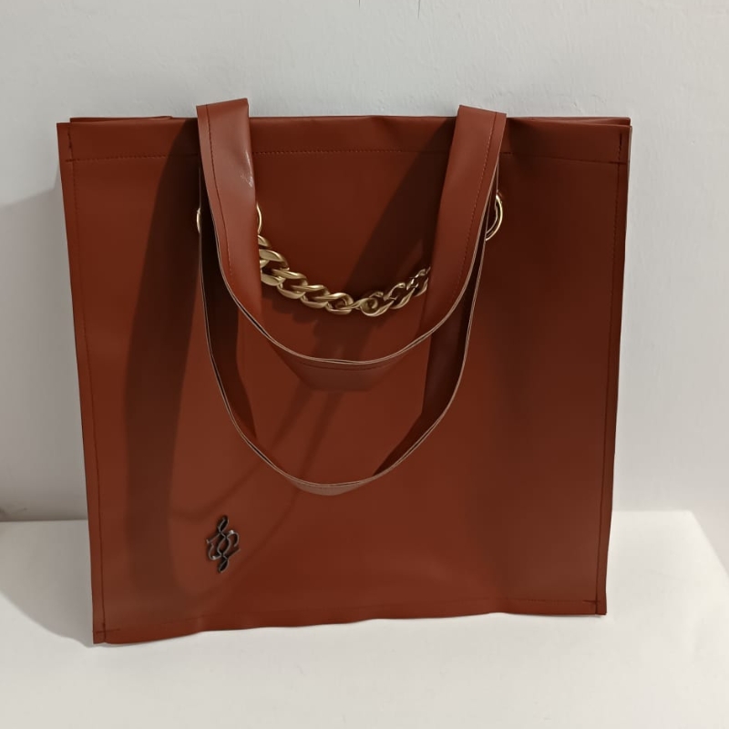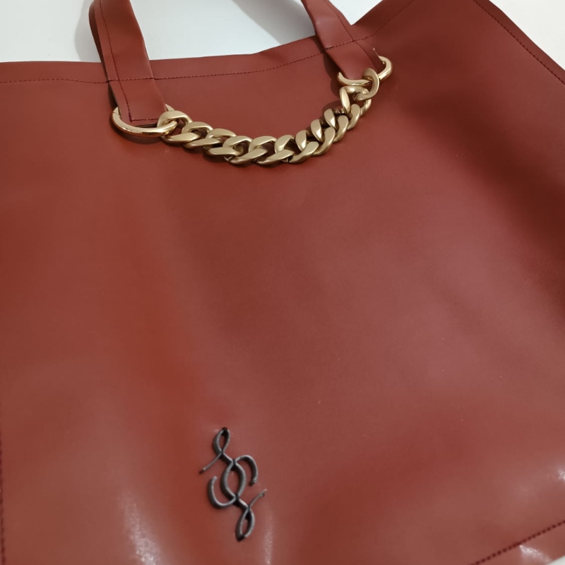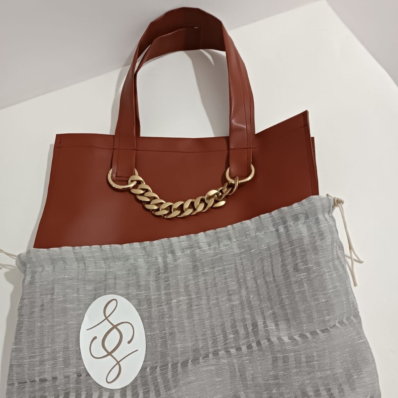 Borsa Shop modello "Francesca" Speciale Rai Linea Verde. Borsa creata in occasione dell'intervista sul programma Linea Verde; borsa marrone ecopelle, con catena dorata e portaborsa grigio