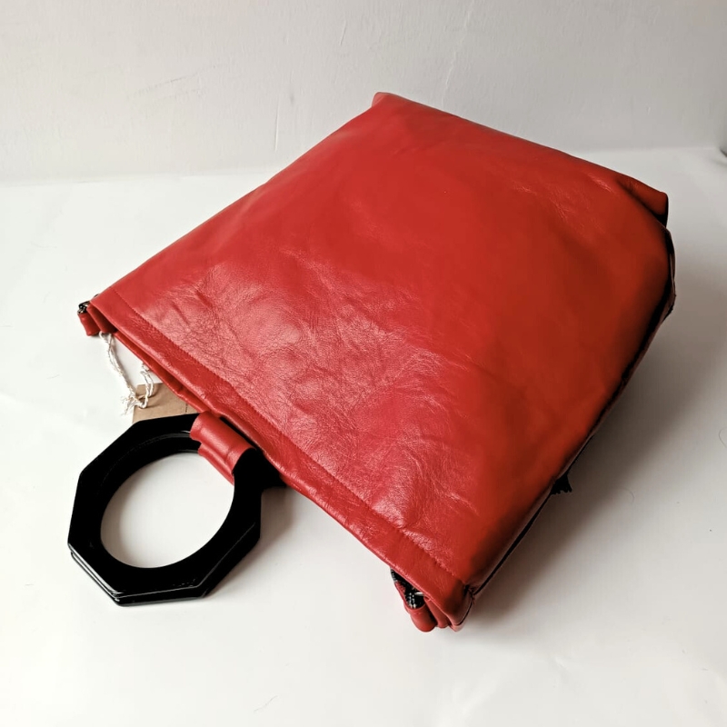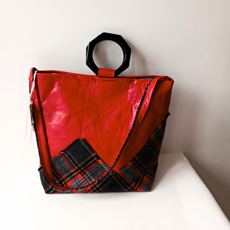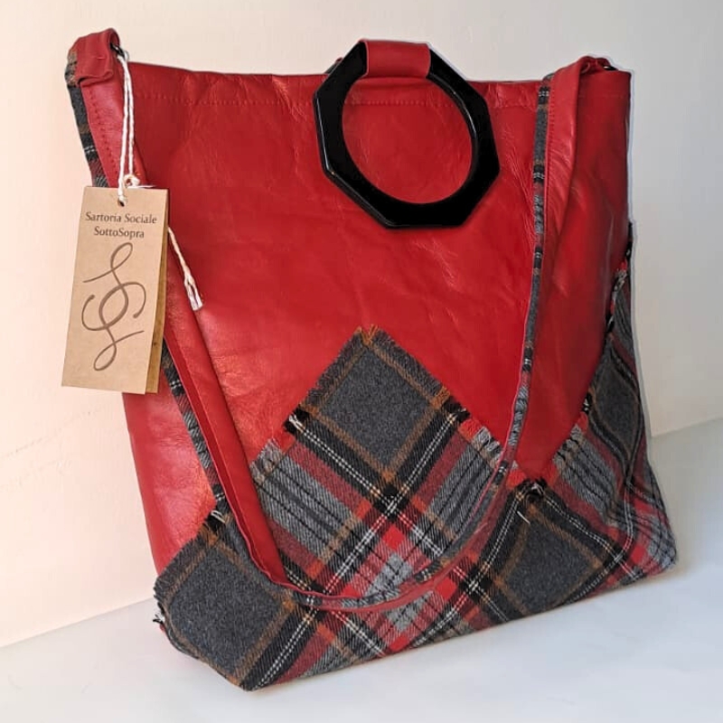 Borsa a mano rossa, in vera pelle con dettagli scozzesi e manico nero