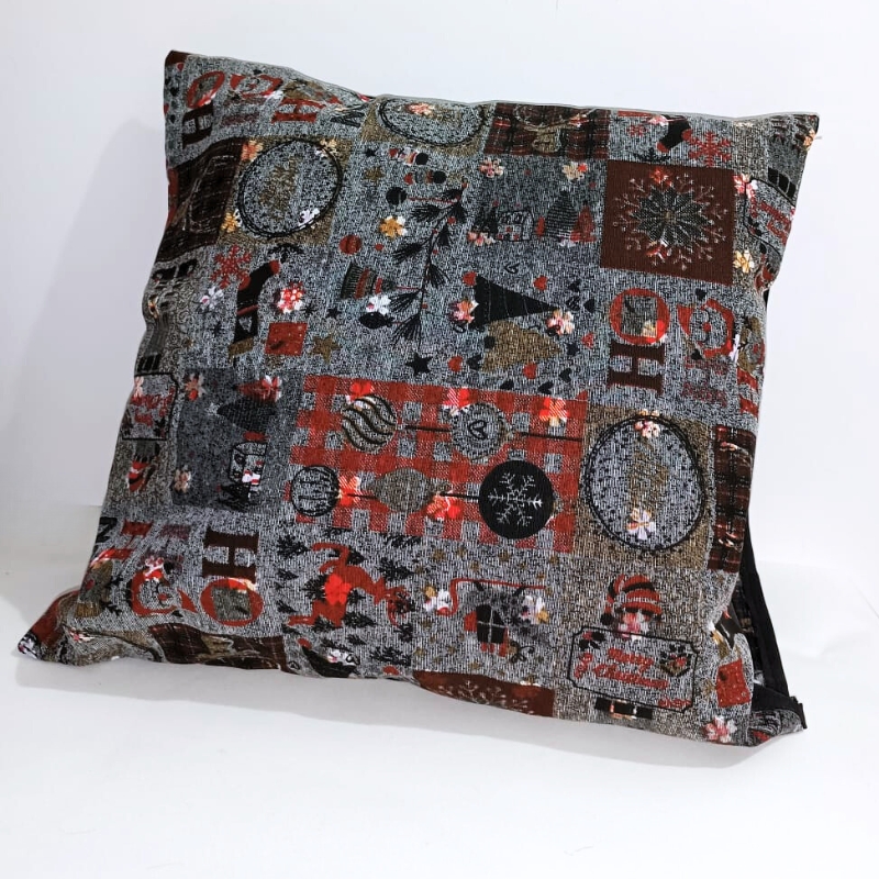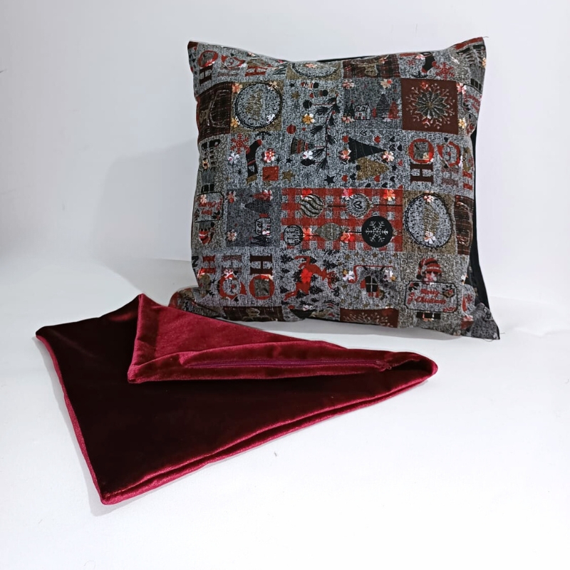 Cuscino realizzato con tessuto riciclato vellutato rosso e grigio. Particolarità: double face