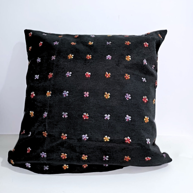 Cuscino realizzato con materiali riciclato. Tessuto nero con ricami floreali.