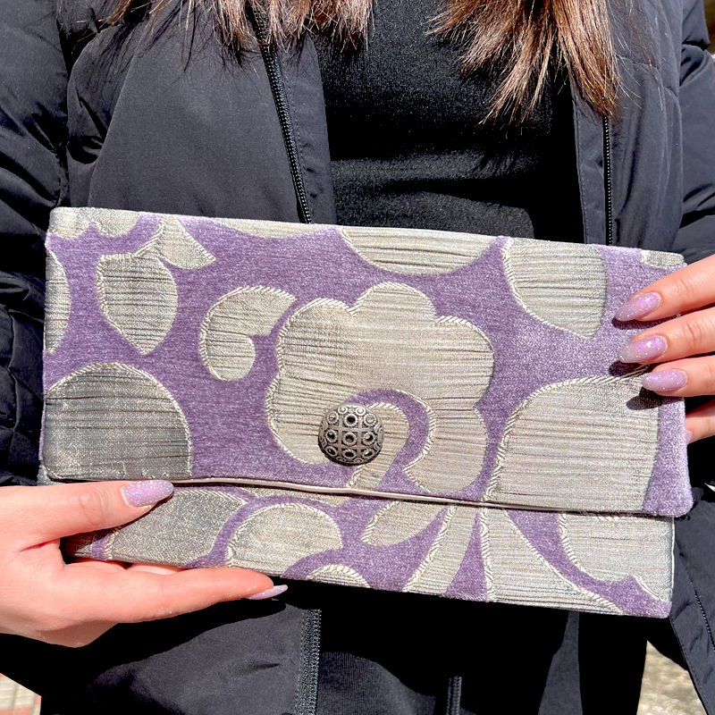 Pochette senza tracolla realizzata in Raso Damascato viola