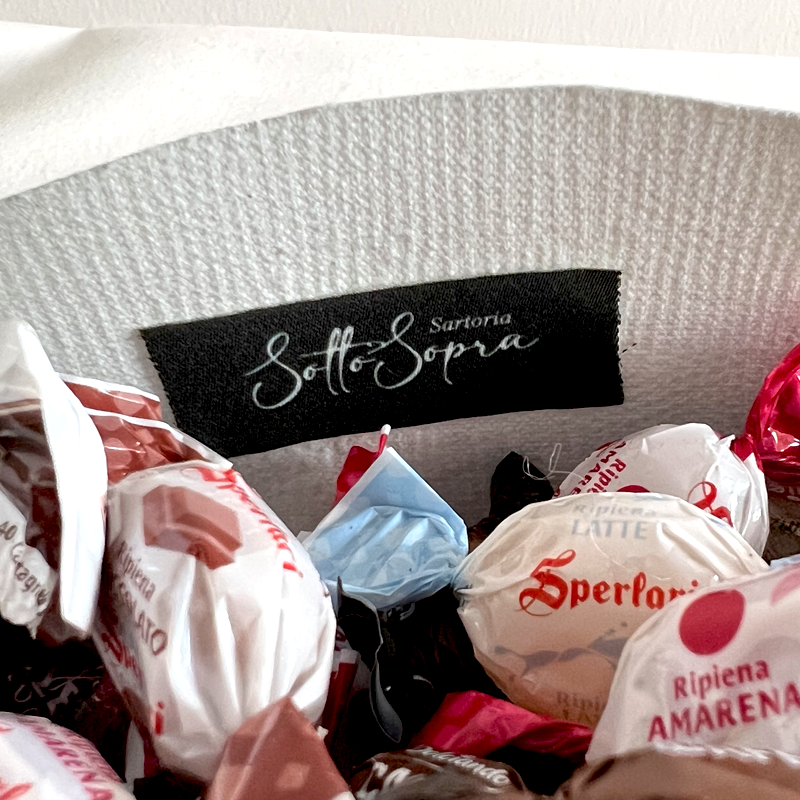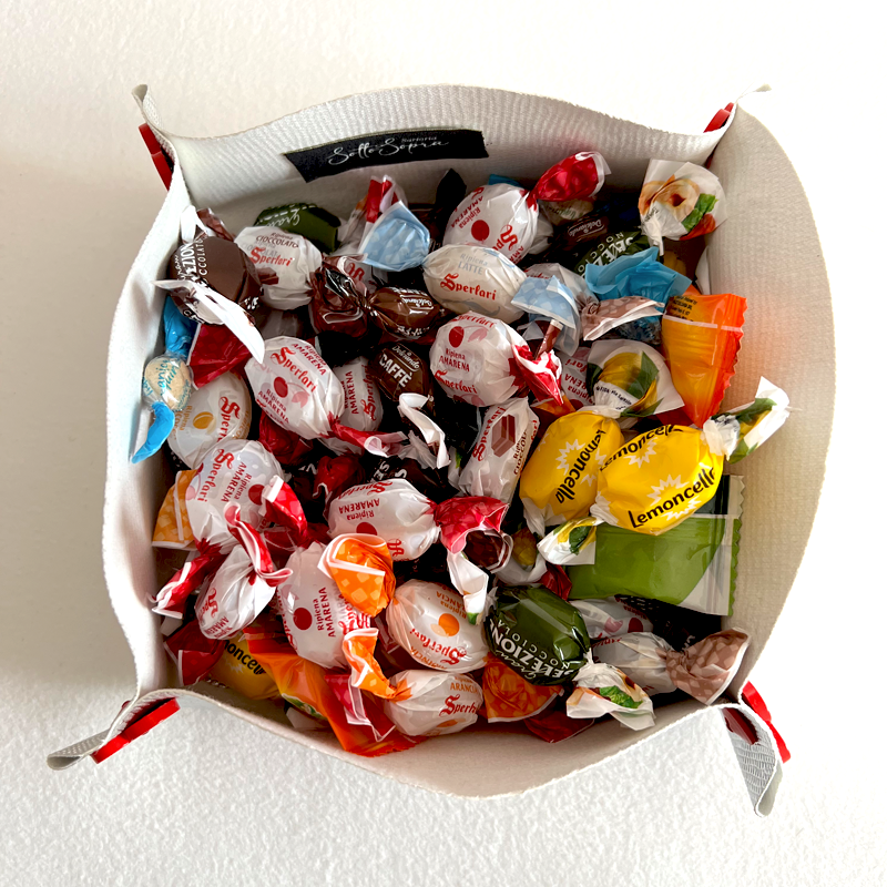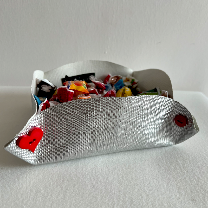 Svuotatasche utilizzabile anche come porta caramelle, porta trucchi, realizzato con tessuto di ecopelle colore argento e bottone a cuore rossi
