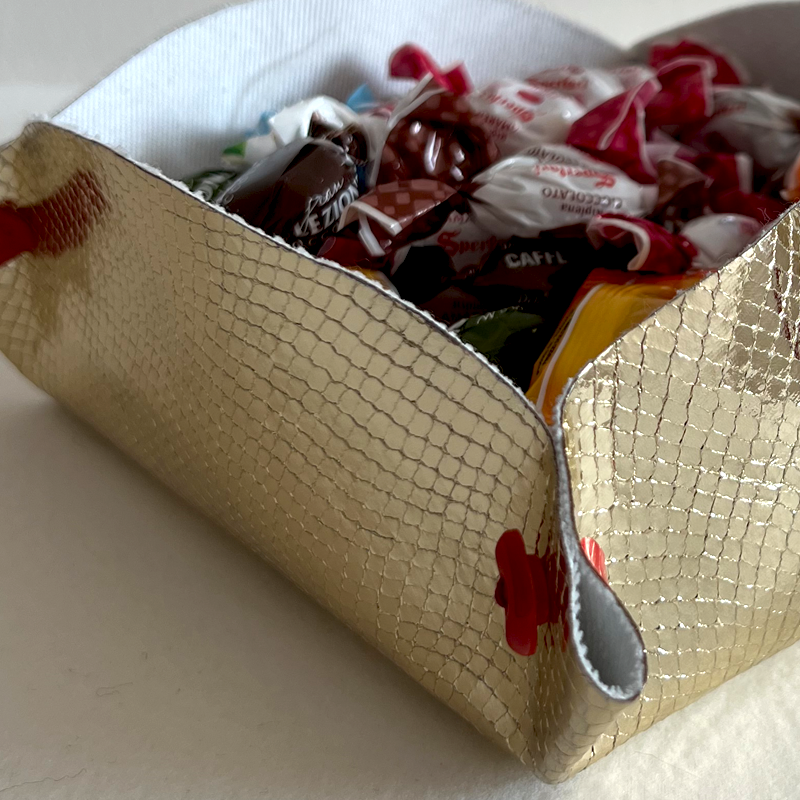 Svuotatasche utilizzabile anche come porta caramelle, porta trucchi, realizzato con tessuto di ecopelle colore oro e bottoni rossi