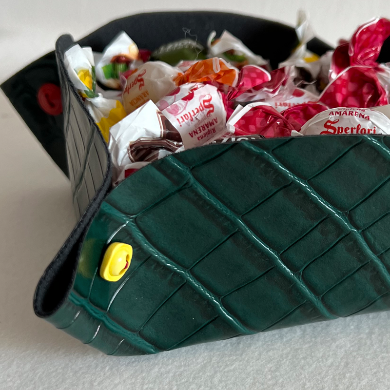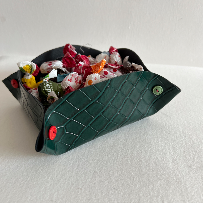Svuotatasche utilizzabile anche come porta caramelle, porta trucchi, realizzato con tessuto di ecopelle colore verde effetto pitone e bottoni colorati
