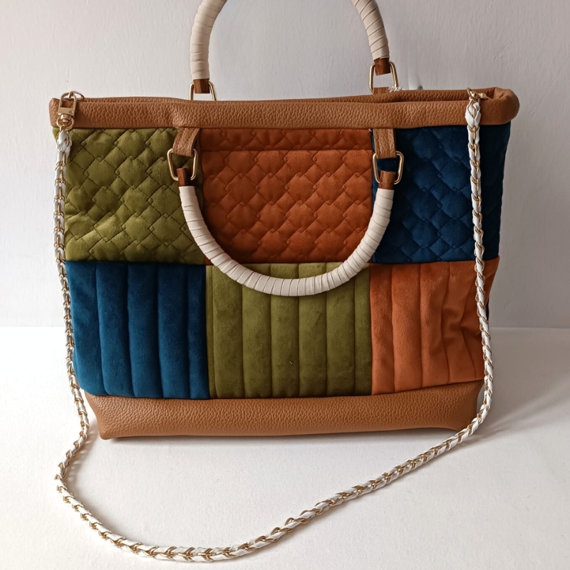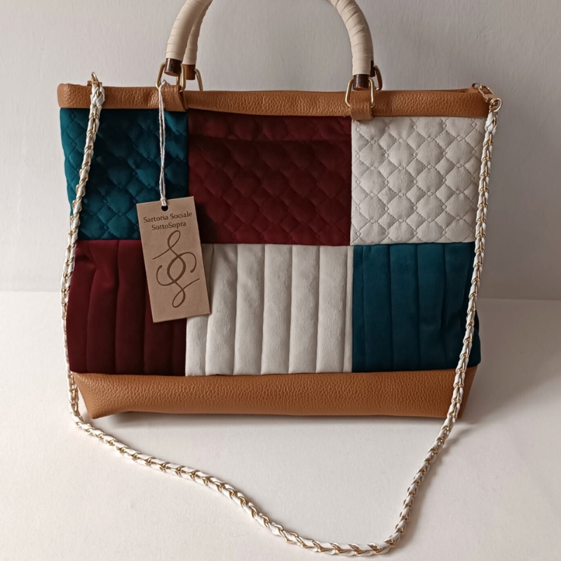 Tracolla multicolor con particolari in risalto realizzata con campioni di tappezzeria.